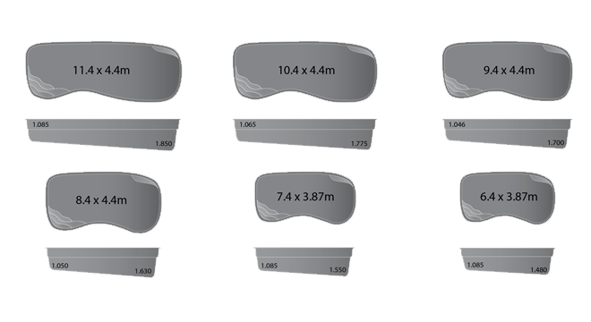 Our gorgeous Harvest pool is available in six lengths with all sizes featuring a safety grip rail and foot ledge. Lengths range from 6.5 to 11.4 metres.